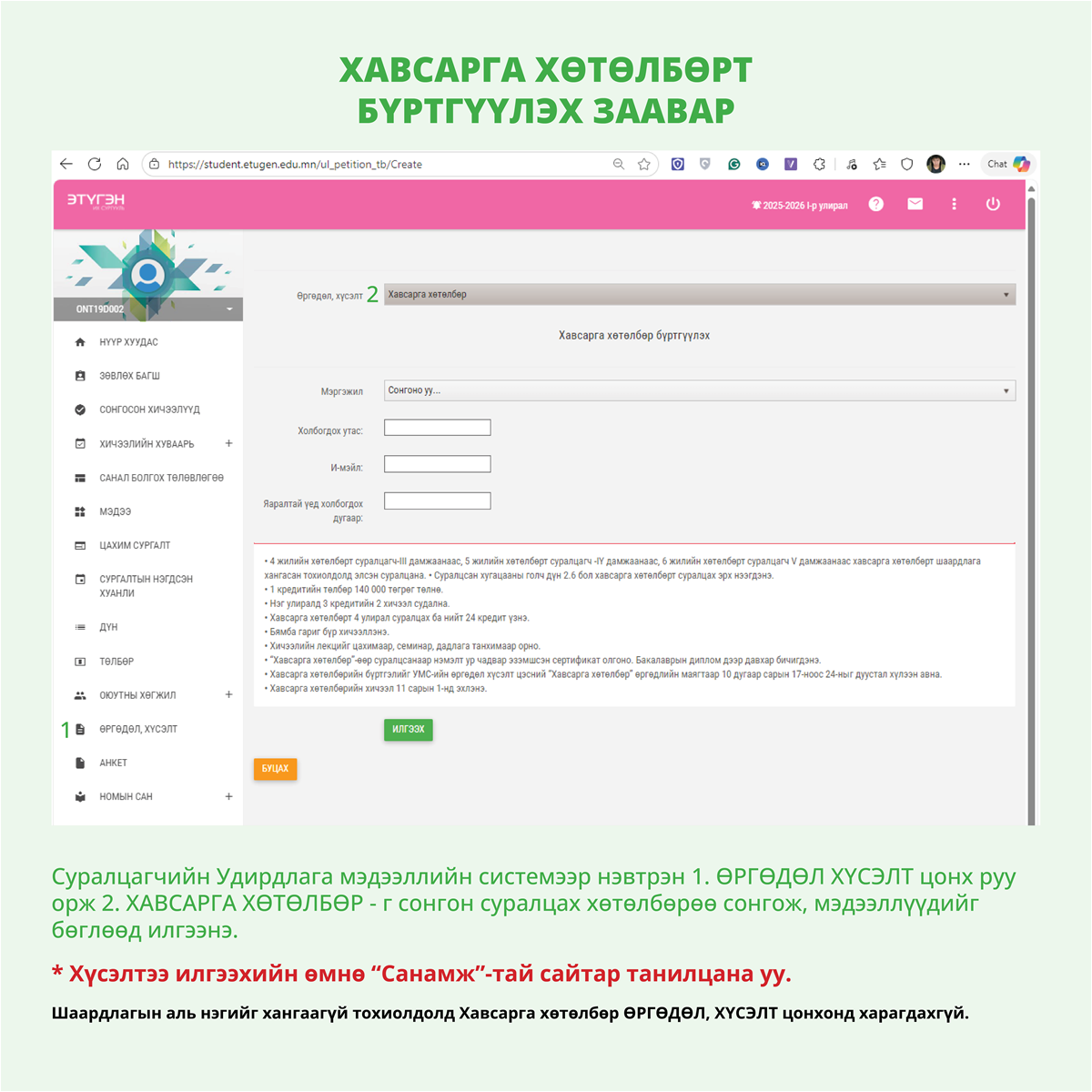 - Бүртгэлийг УМС-ийн “Өргөдөл хүсэлт” цэсний “Хавсарга хөтөлбөр” маягтаар хүлээн авна.