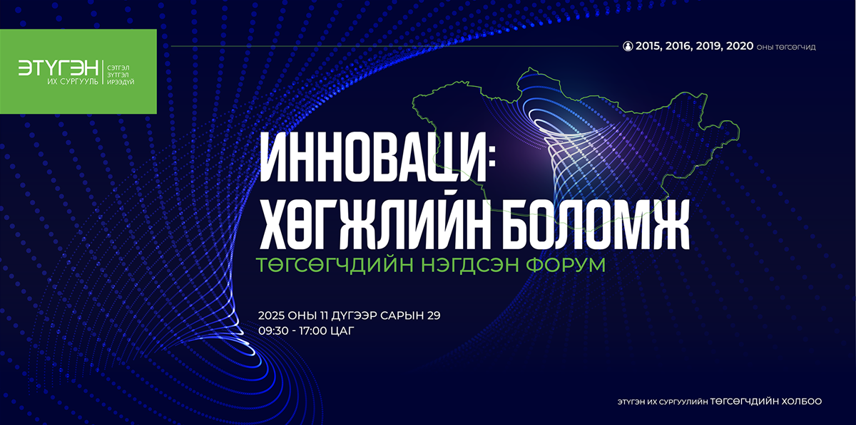 Этүгэн их сургууль нь хөгжлийн алсын хараа, итгэл найдвар, боломжоо төгсөгчидтэйгээ хуваалцаж, хамтран ажиллахаар "Инноваци: Хөгжлийн боломж" сэдэвт төгсөгчдийн нэгдсэн форумыг 2025 оны 11 сарын 29-нд зохион байгуулах тул эрхэм хүндэт төгсөгч та бүхнийг хүрэлцэн ирэхийг урьж байна.